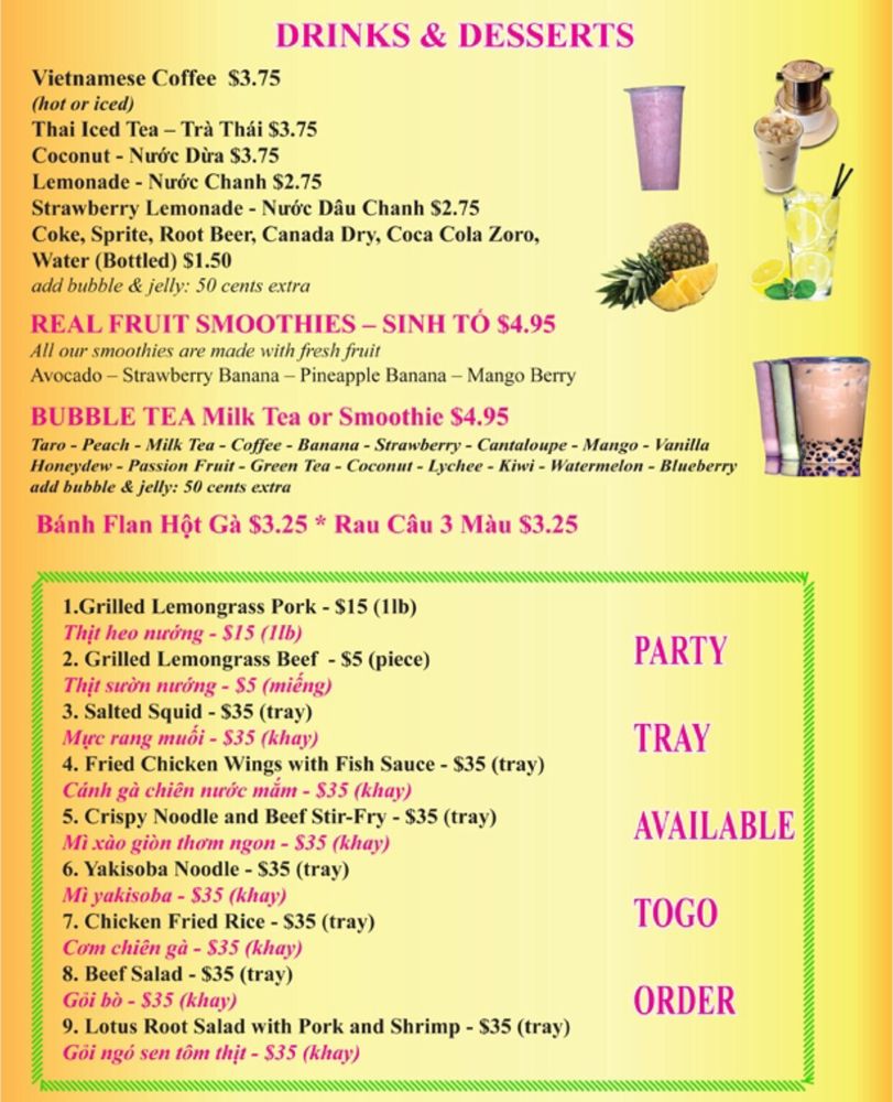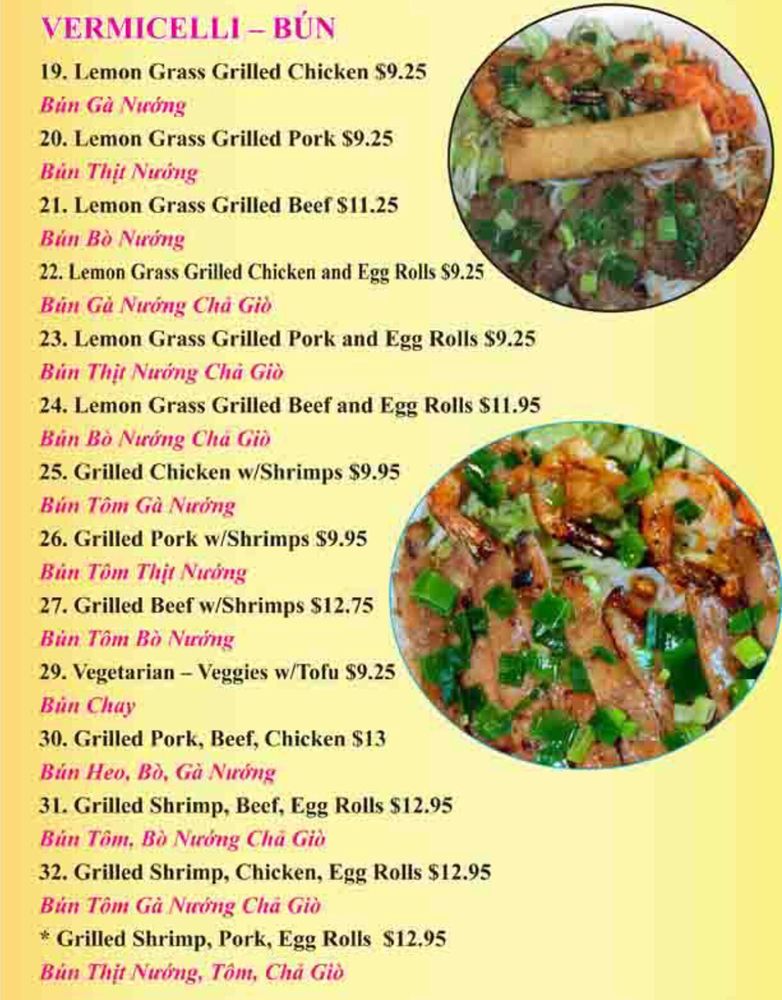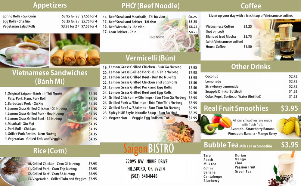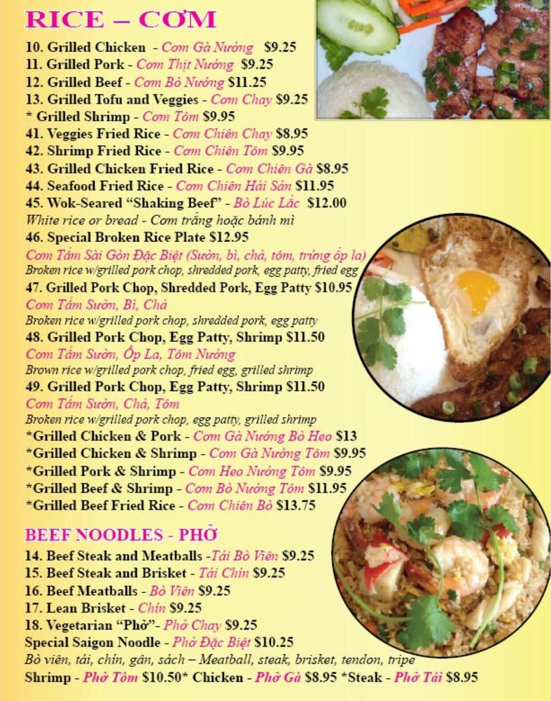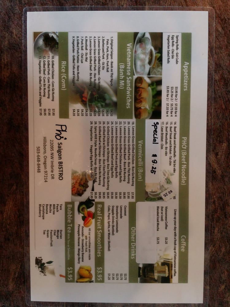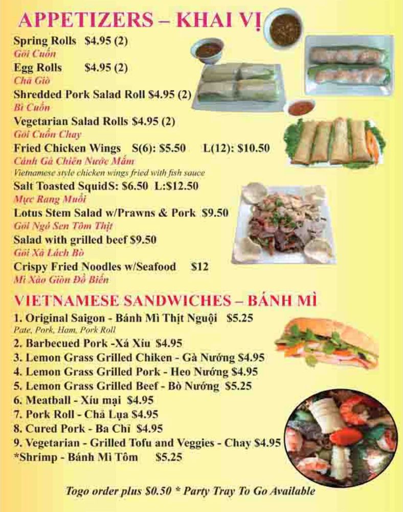 Pho Saigon Bistro, located in Hillsboro, Oregon, offers a menu filled with authentic Vietnamese dishes. From flavorful appetizers like the Fried Chicken Wings and Salt Toasted Squid to Vietnamese Sandwiches like the Original Saigon Sandwich and Barbecued Pork Sandwich, there is something for everyone to enjoy. The Rice options range from Grilled Chicken to Seafood Fried Rice, all cooked to perfection. Customer reviews praise the rich and flavorful broth of the pho, the tenderness of the lemongrass beef Banh mi, and the fresh and flavorful vermicelli bowls. While some mention the high prices, the quality and taste of the food make it worth it. With a cozy ambiance, friendly service, and a variety of options for everyone, Pho Saigon Bistro is a must-visit for those craving authentic Vietnamese cuisine.
